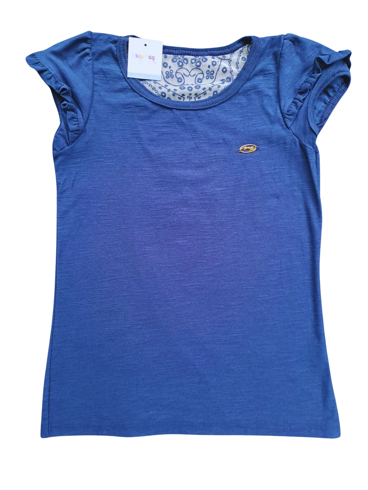 Essa blusa azul é perfeita para meninas que gostam de um toque especial no look. Com babadinhos nas mangas e um lindo detalhe em renda nas costas com estampa floral, ela combina conforto e charme na medida certa. Ideal para compor produções casuais ou mais arrumadinhas.