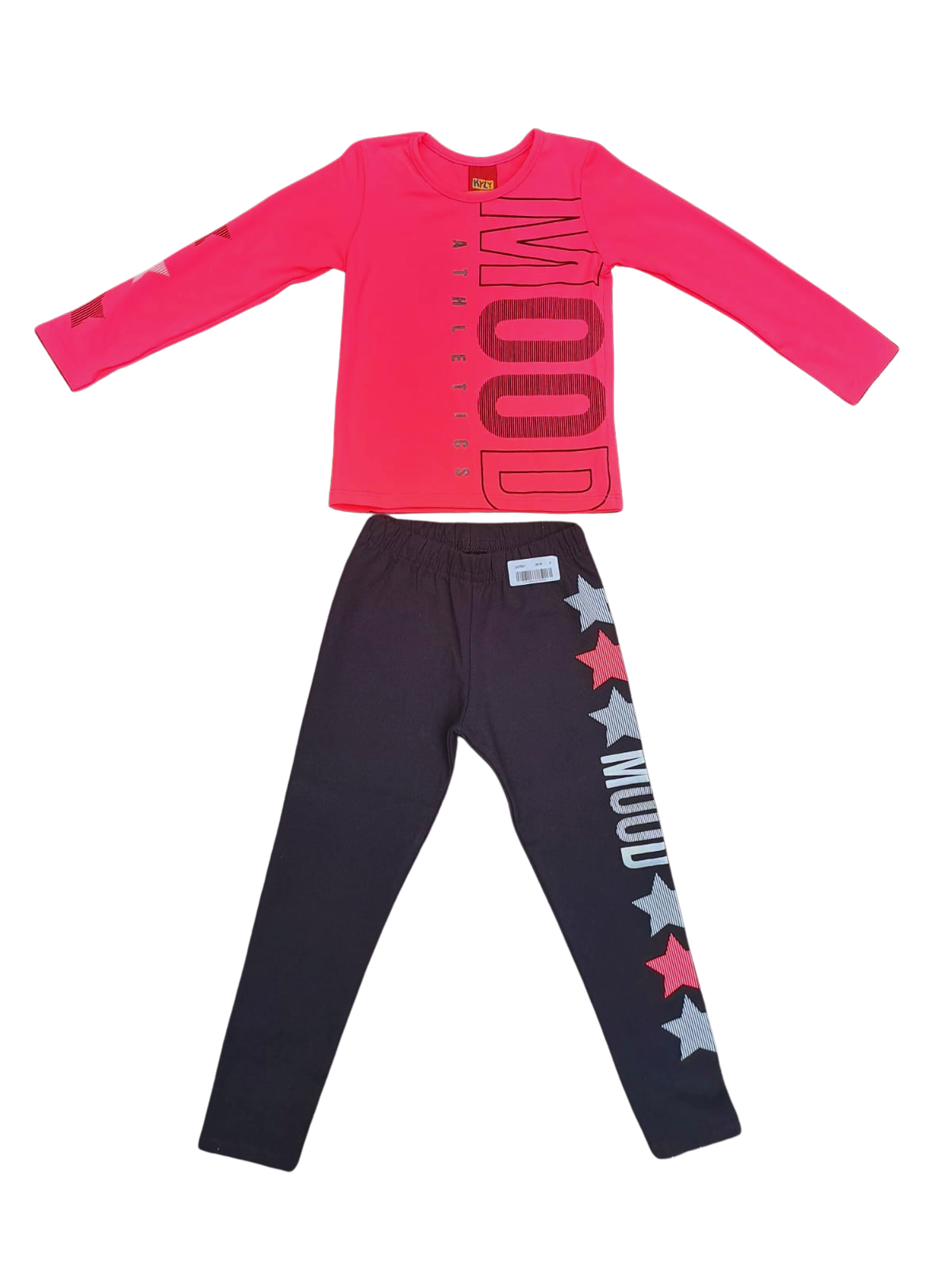 Este conjunto conta com uma blusa manga longa na cor rosa vibrante, estampada com a palavra "MOOD" em destaque, perfeita para expressar a personalidade das meninas. A calça preta traz um toque divertido com estrelas coloridas nas laterais, unindo conforto e charme.