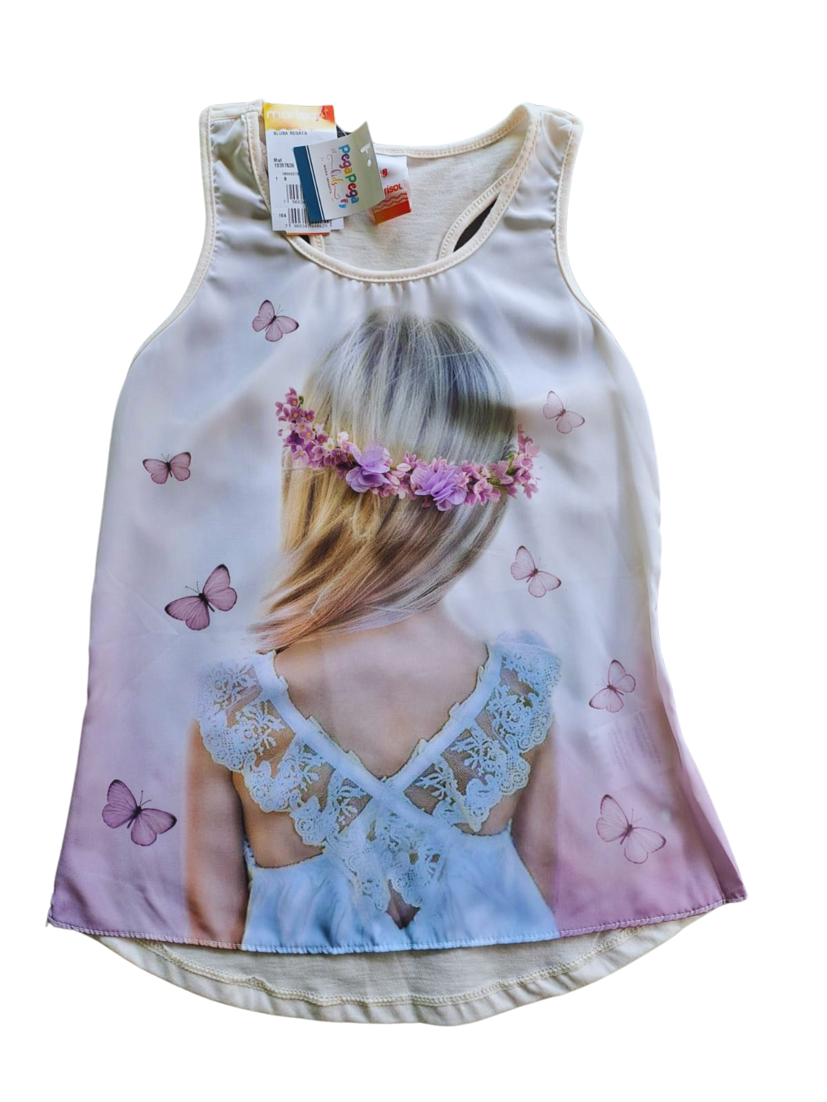Delicadeza e charme em uma peça encantadora! Essa regata infantil feminina da marca Marisol traz uma estampa exclusiva com imagem artística de uma menina vista de costas, usando uma coroa de flores e vestido com renda nas costas, rodeada por borboletas em tons suaves. O design romântico e sonhador faz desta peça uma escolha perfeita para momentos especiais ou produções cheias de ternura no dia a dia. Confeccionada com tecido macio e leve, oferece conforto e estilo para sua pequena brilhar com muita graça.
