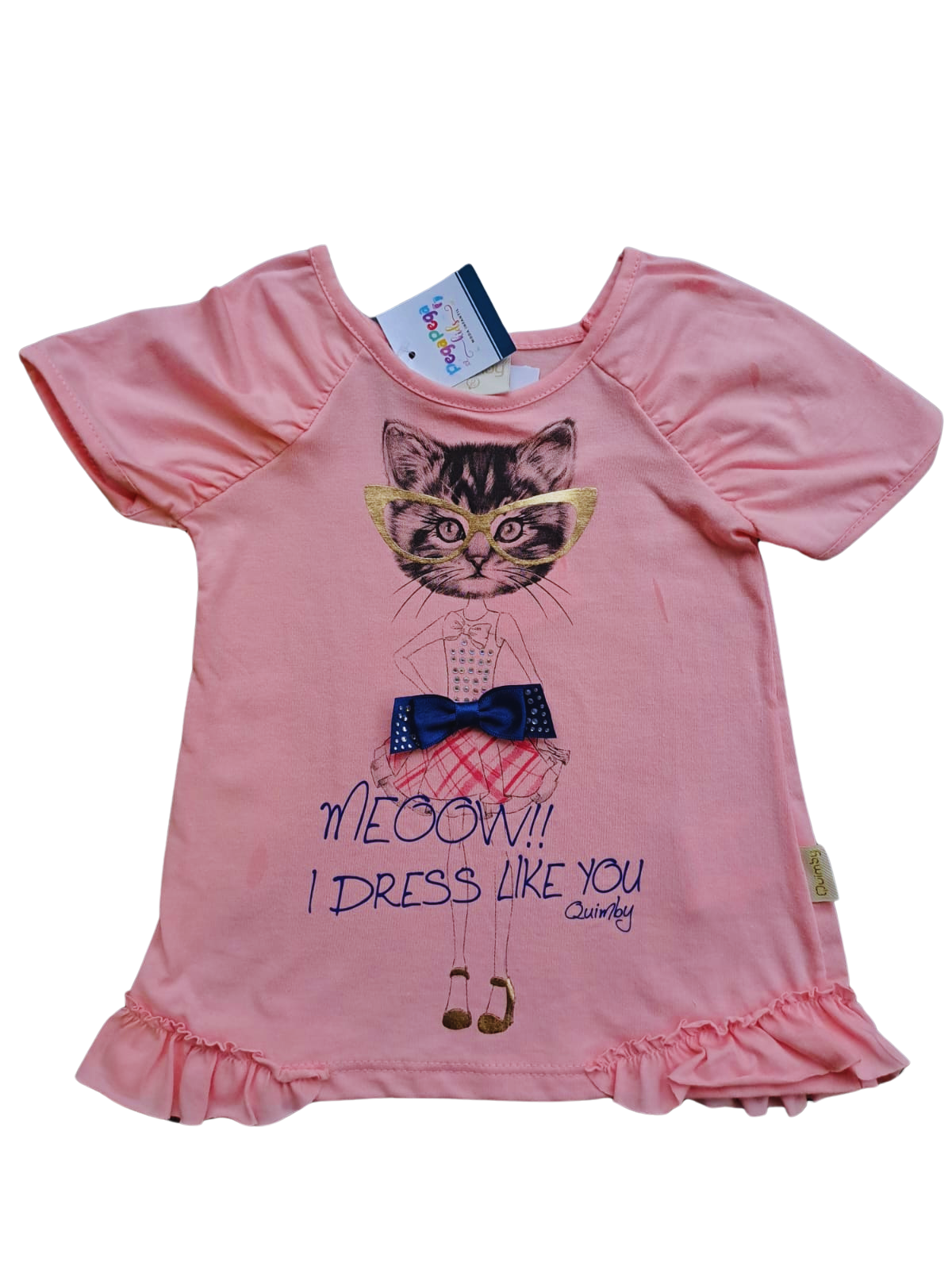 A camiseta perfeita para meninas que amam estilo e fofura! Com estampa divertida de uma gatinha estilosa, óculos dourado e um laço azul real aplicado na peça, ela é puro charme. A frase “Meoow!! I dress like you” deixa o visual ainda mais descolado.