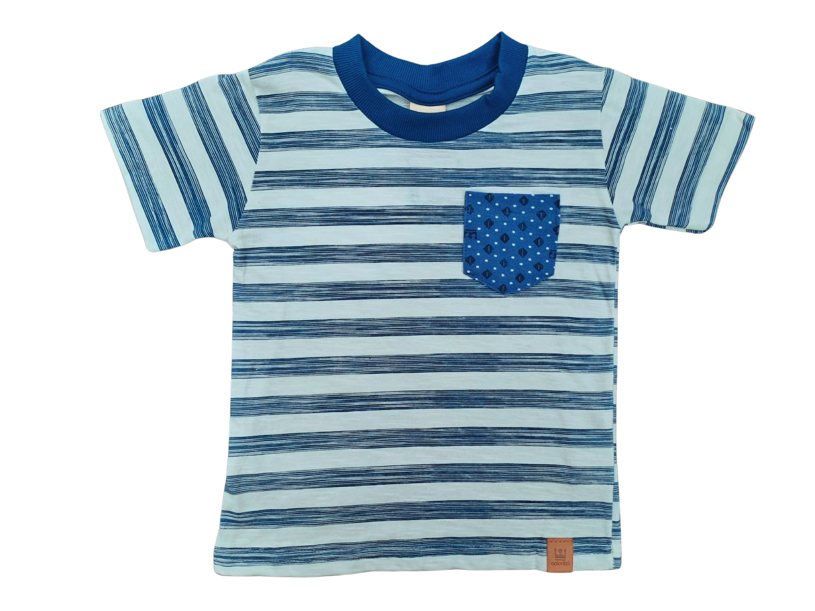 Cheia de personalidade, essa camiseta infantil é perfeita para os pequenos que gostam de se vestir bem com conforto. O destaque fica por conta do bolso estampado em azul com detalhe geométrico, que contrasta de forma divertida com as listras horizontais da peça.