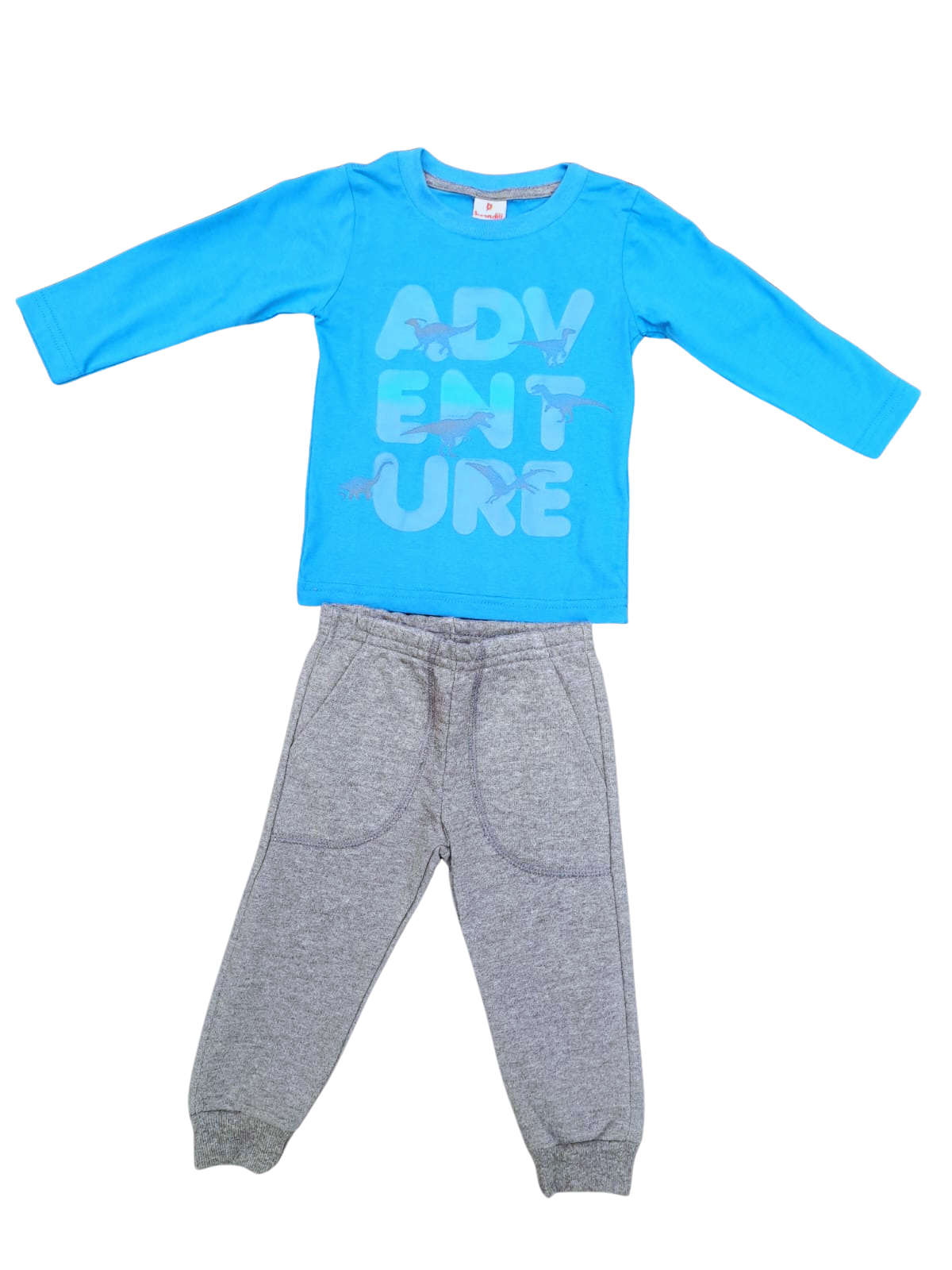 A camiseta azul de manga longa traz uma estampa divertida com a palavra "ADVENTURE" e dinossauros, estimulando a imaginação e a brincadeira. Feita em tecido macio, é ideal para o dia a dia das crianças.