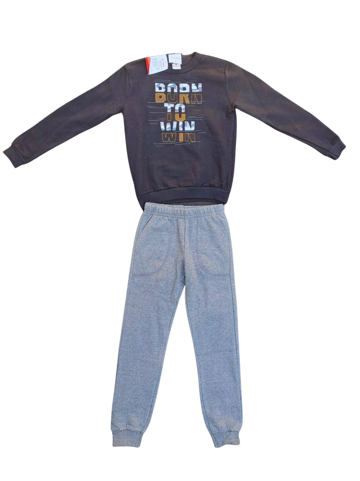 Esse conjunto infantil masculino é perfeito para meninos cheios de energia. A blusa preta com estampa "Born to Win" transmite motivação e estilo, enquanto a calça de moletom cinza garante liberdade para brincar e se movimentar com conforto.