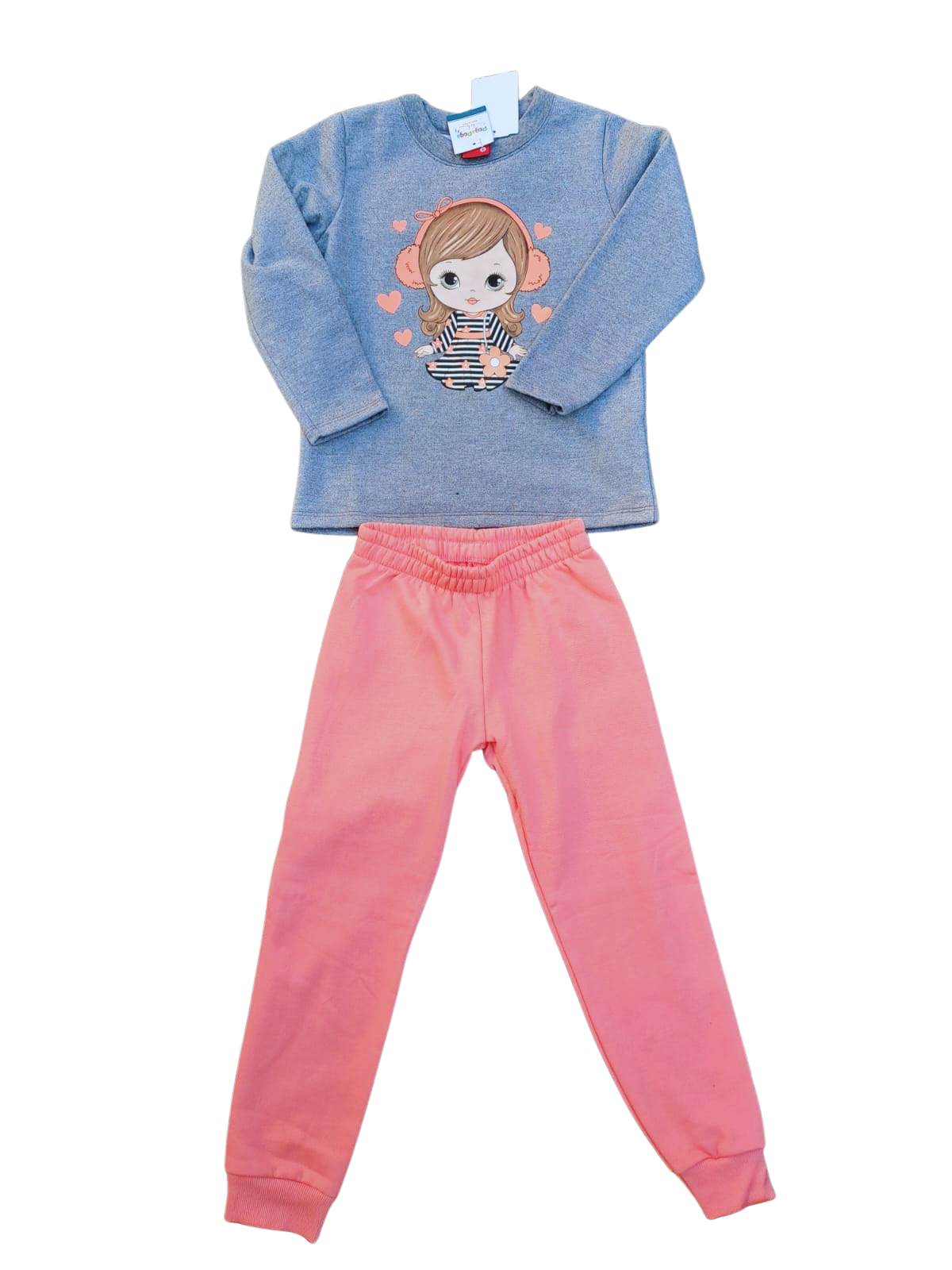 • Blusa manga longa com estampa delicada de uma bonequinha fofa com protetores auriculares, rodeada por corações, trazendo um toque adorável ao visual