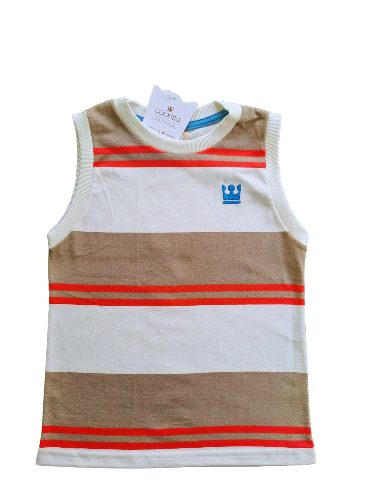 • Regata sem mangas com listras horizontais em tons neutros e detalhes em vermelho vibrante