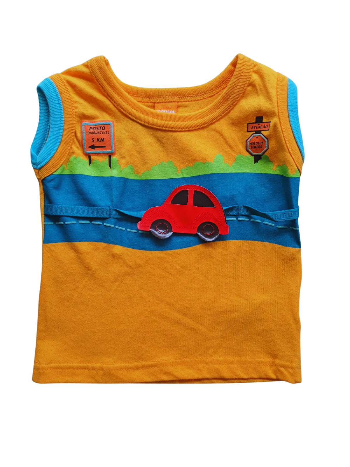 Essa regata infantil é perfeita para dias quentes e momentos de brincadeira. Com uma estampa vibrante de estrada, paisagem e um carro em aplique 3D, ela transforma o visual dos pequenos em uma verdadeira aventura sobre rodas! O tecido leve e confortável garante liberdade de movimento e bem-estar o dia todo.
