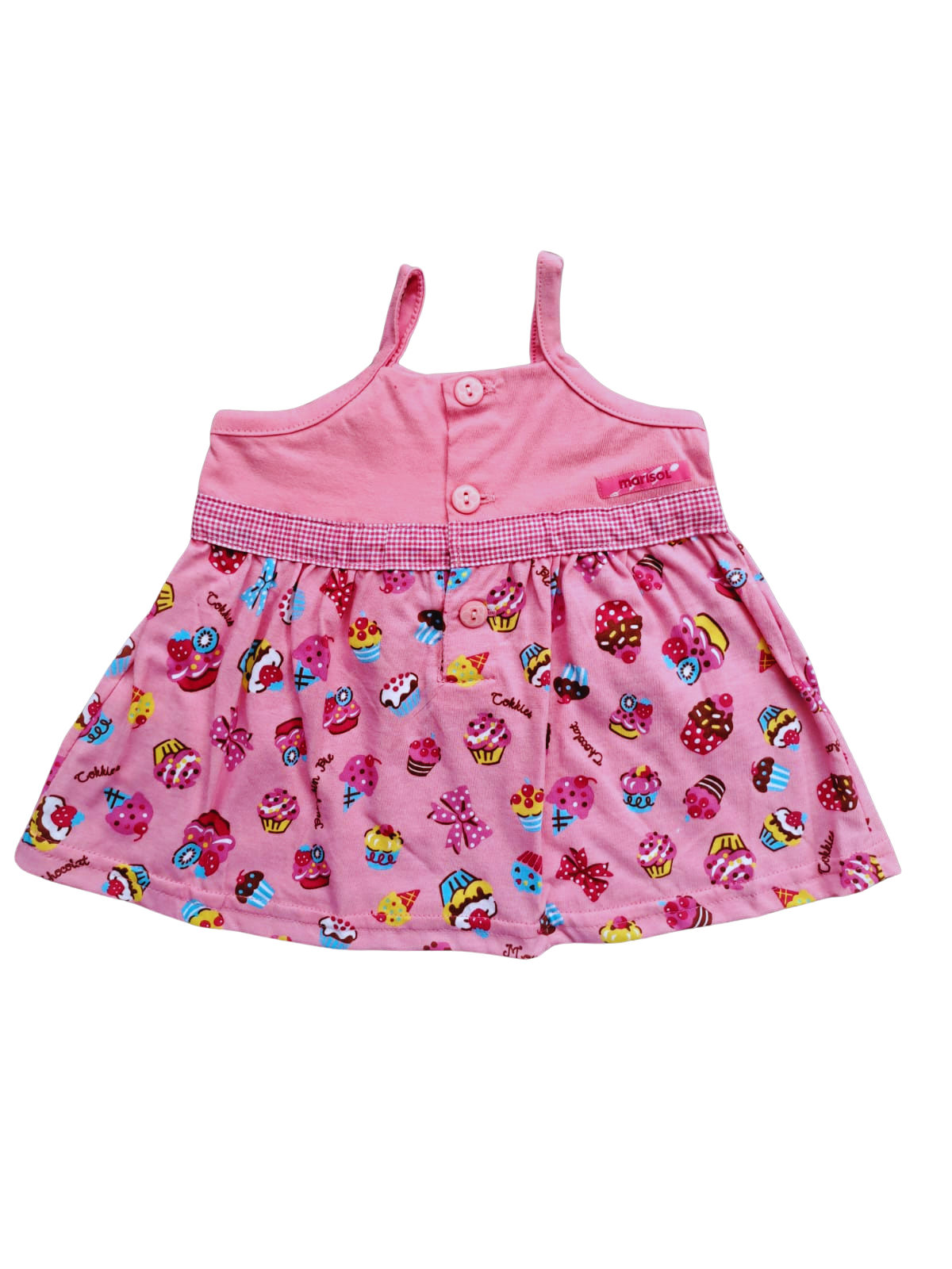 Uma explosão de fofura e cor! Esse vestido infantil da Marisol é perfeito para dias quentes, com alcinhas finas e estampa alegre de cupcakes, donuts e docinhos que encantam qualquer criança. O detalhe em botões nas costas e a faixa xadrez na cintura completam o charme dessa peça.
